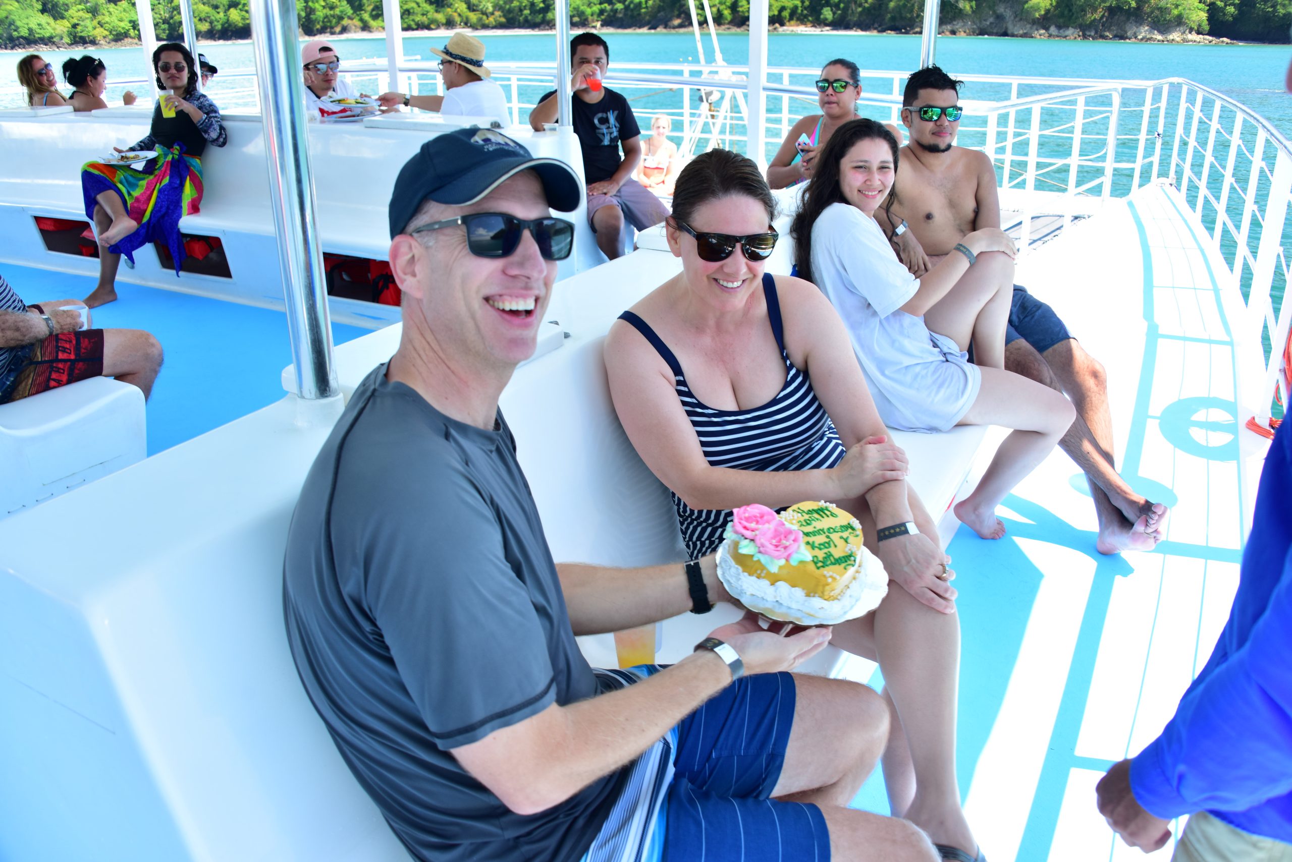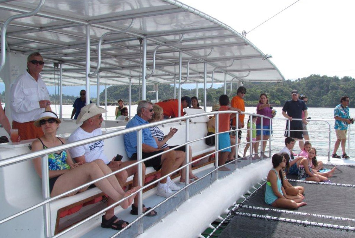 The Tom Cat II, is a roofed and shaded 70-foot sailing cat with a seating capacity of 110.